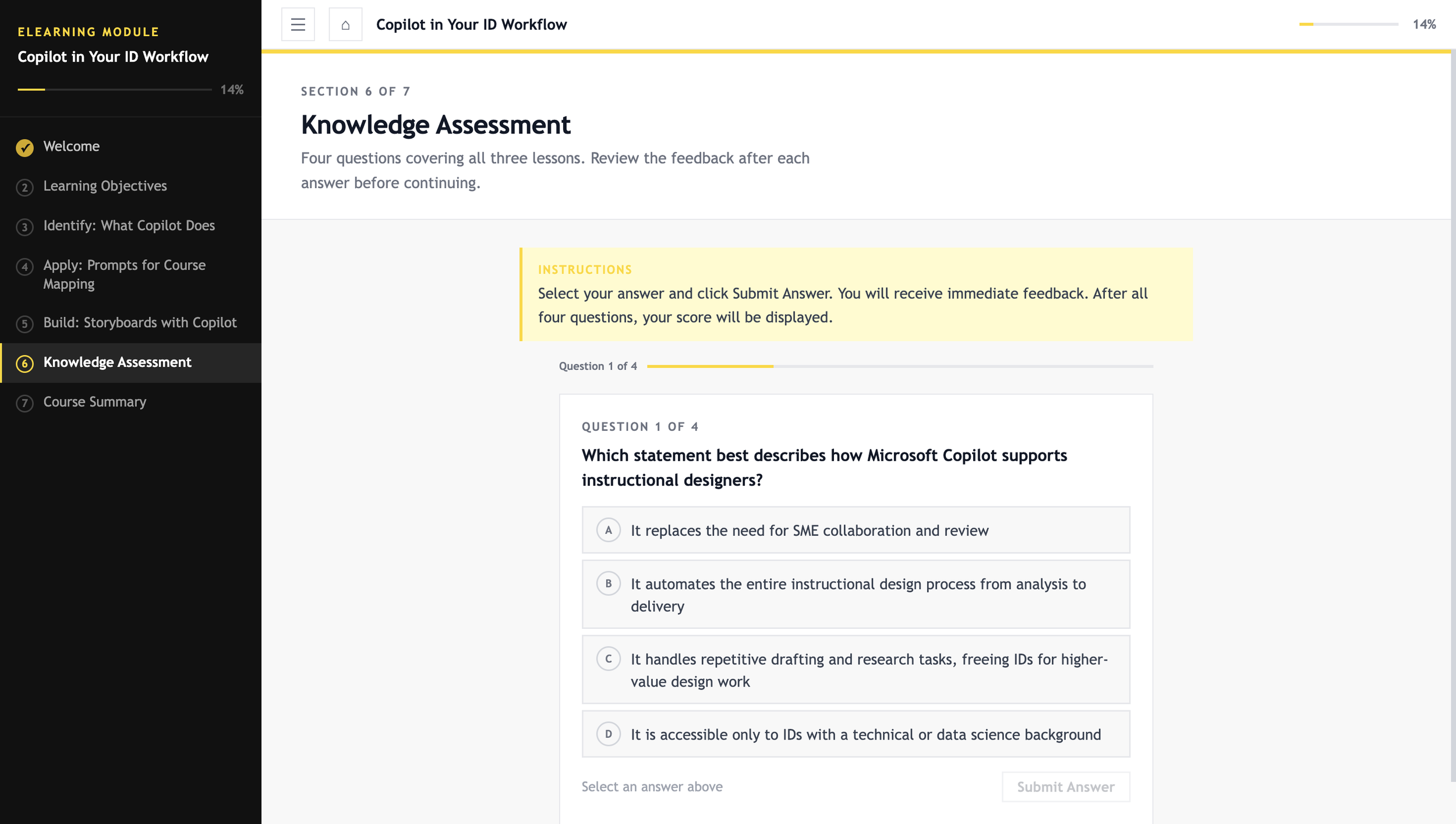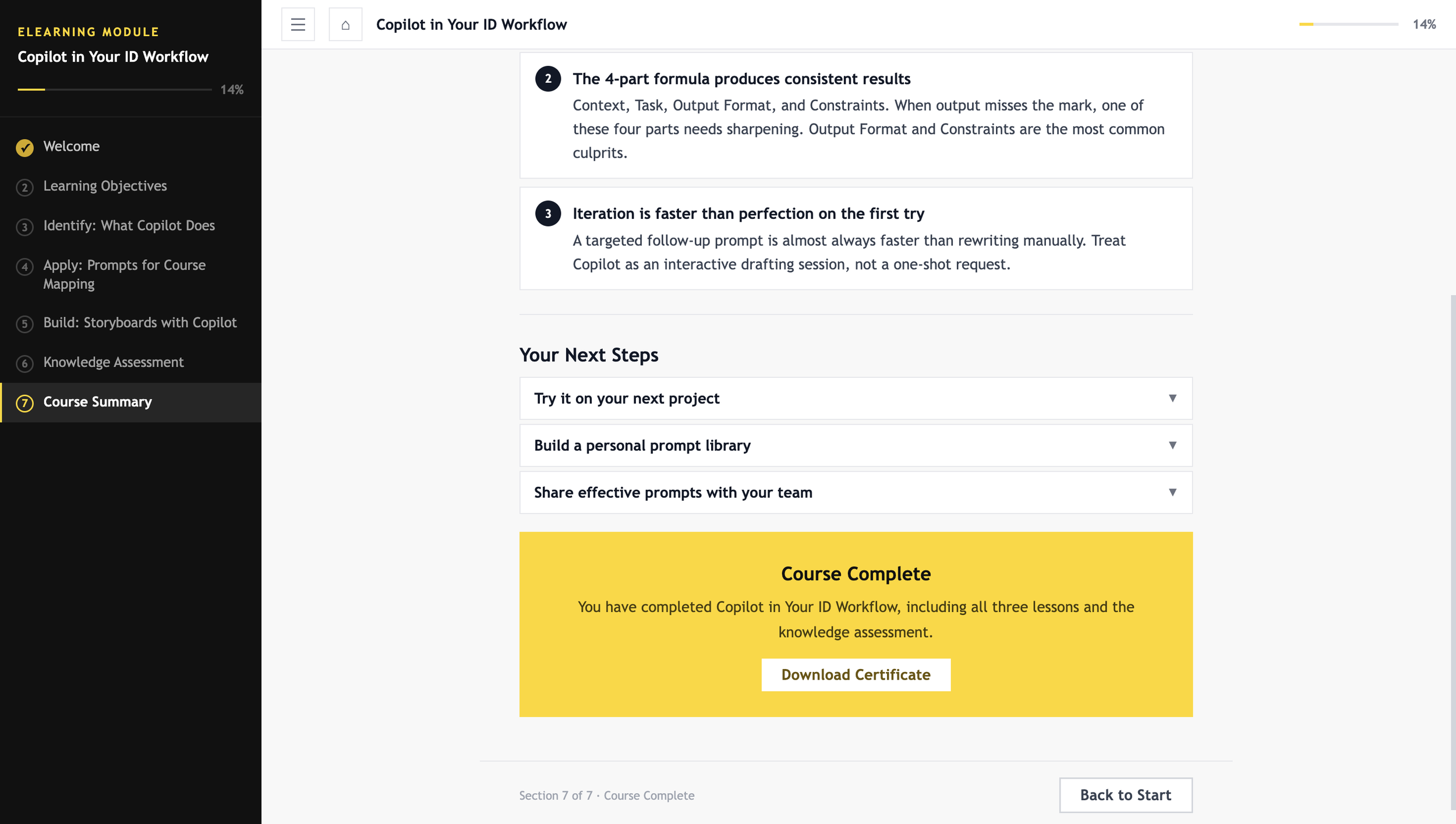The goal was to build something that addressed both needs at once: a course that teaches IDs how to use Copilot, built using AI as the development engine. I led all the instructional design and content decisions while using Claude AI to handle the technical build through structured prompts and iterative feedback.