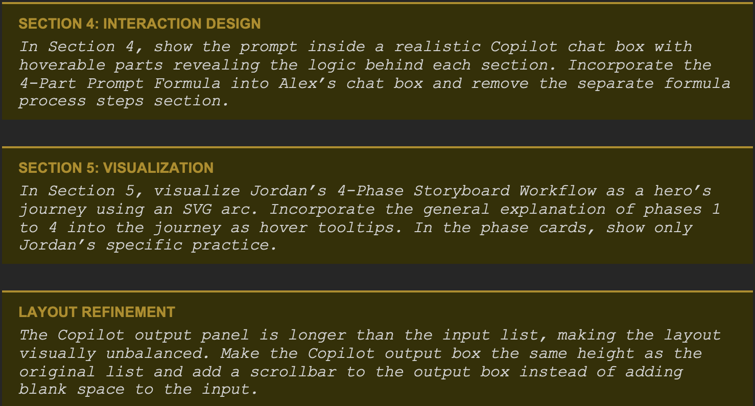 This review-and-redirect cycle repeated across every section. My role was to evaluate each output as a designer: keep what worked, push back on what didn't.