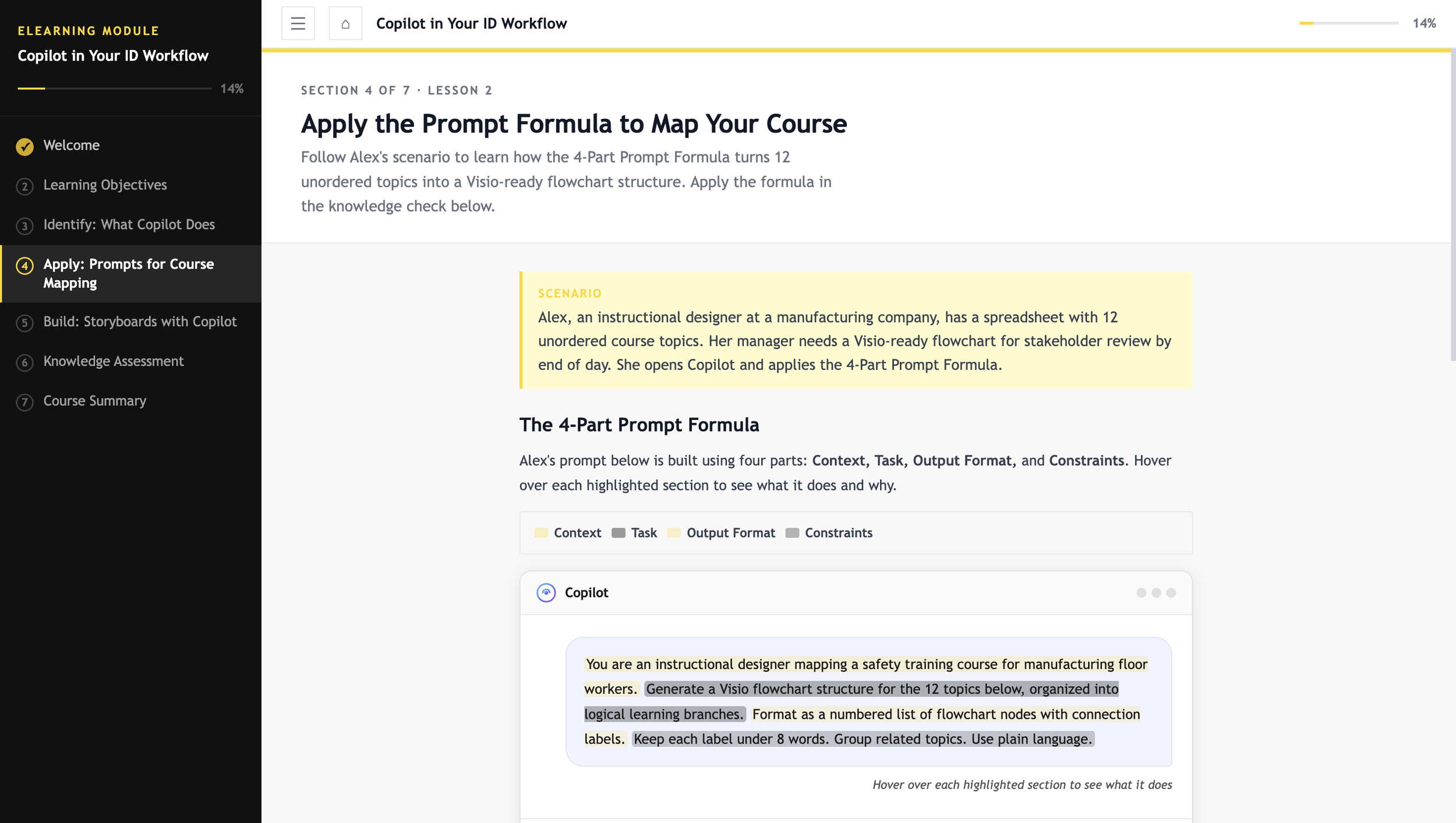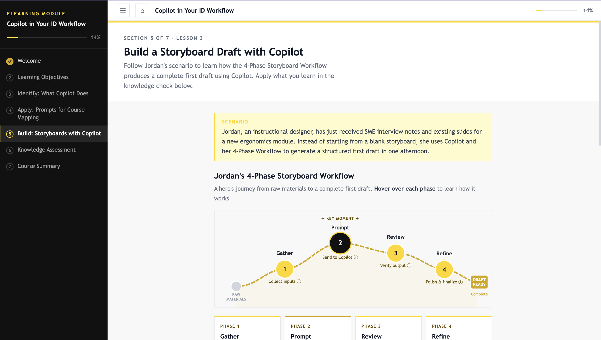 The topic was chosen for a practical reason. Working with colleagues who were starting to use AI tools in their daily Instructional Design work, I noticed a common gap: people wanted guidance on using Copilot for actual ID tasks like drafting storyboards or writing learning objectives, not just generic AI tutorials. This prototype is a direct response to that need.