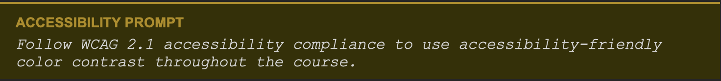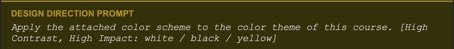 After the content was finalized, I chose a high-contrast visual theme (black, white, and yellow) and applied it through a single design prompt. The AI updated all colors across the course, including CSS variables, SVG elements, and inline styles.