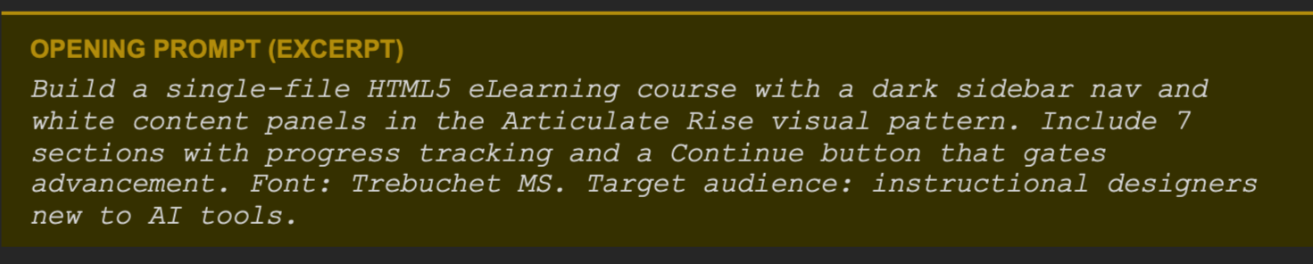 The AI generated the full course shell, including navigation, layout, section scaffolding, and interactive gating logic, in a single output. I then reviewed it against the learning objectives before moving into content development.