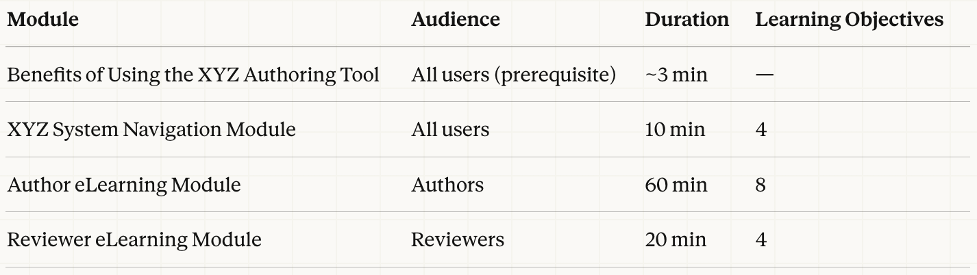 The curricula were developed for a pharmaceutical company operating in a regulated GxP environment, where system training is a mandatory prerequisite for system access. The full training program comprised a standalone prerequisite video and a series of role-based eLearning modules, each tailored to a distinct system role. The prerequisite video, Benefits of Using the XYZ Authoring Tool, is the featured deliverable in this showcase.